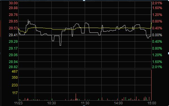 2011年11月23日臨近收盤期間(14:56:24至14:59:28),任某某為了在短期內(nèi)拉升股價(jià),大量申報(bào)買入“X”4筆共計(jì)63,000股,占尾市階段市場(chǎng)申買量的比例高達(dá)75.54%;委托價(jià)格由29.60元升至32.00元,每筆均高于當(dāng)時(shí)市場(chǎng)上的買1檔價(jià)格,三分鐘內(nèi)將股價(jià)由29.35元拉升至30元收盤,拉升幅度達(dá)2.21%。(見(jiàn)下圖)